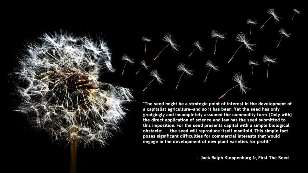 One such space of freedom is the seed. As the irrepressible source of life, the seed’s ability to reproduce itself vigorously populated and nourished a biodiverse planet. Farmers saved and exchanged seeds with each other freely for millennia to breed plants that are suitable to their environments and meet their communities’ various needs, not just the economic and culinary, but also the social, cultural, and political dimensions of community life. And for generations it is the seed’s innate ability to self-reproduce that allows it to circumvent the commodifying impulse of industry for profit-making.